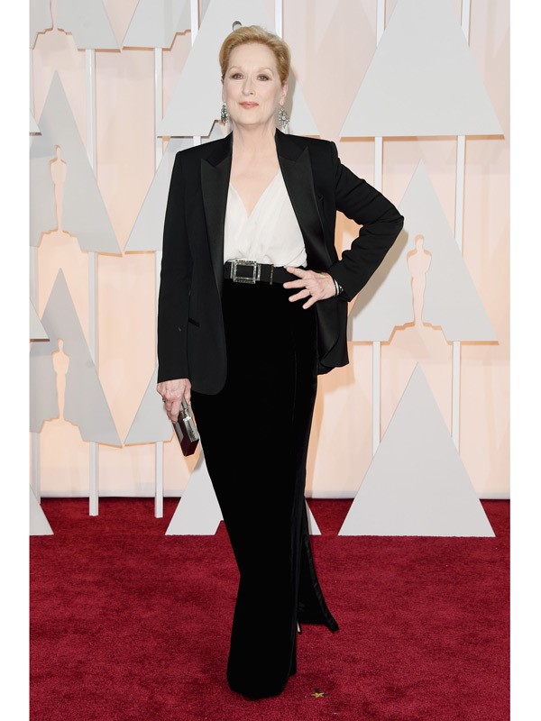 Keava: Meryl always looks so graceful and elegant. She makes masculine tailoring look feminine. I do wish, however, that with such a classic, simple colour scheme, she had played with her makeup more: maybe a statement lip or stronger brows?